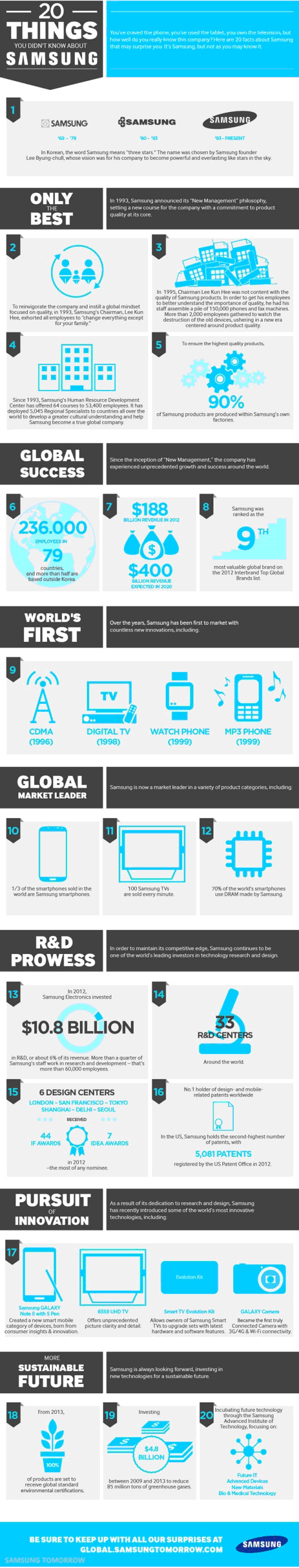 A Samsung está arrebentando na venda de smartphones e tablets, mas você conhece bem a empresa? O infográfico abaixo revela 20 curiosidades sobre a empresa sul coreana.
